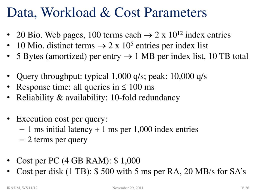 Data, Workload & Cost Parameters • 20 Bio. Web pages, 100 terms each 2 x 1012 index entries • 10 Mio. distinct terms 2 x 105 entries per index list • 5 Bytes (amortized) per entry 1 MB per index list, 10 TB total • Query throughput: typical 1,000 q/s; peak: 10,000 q/s • Response time: all queries in 100 ms • Reliability & availability: 10-fold redundancy • Execution cost per query: • 1 ms initial latency + 1 ms per 1,000 index entries • 2 terms per query • Cost per PC (4 GB RAM): $ 1,000 • Cost per disk (1 TB): $ 500 with 5 ms per RA, 20 MB/s for SA’s IR&DM, WS'11/12