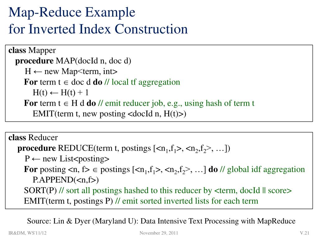 Map-Reduce Example for Inverted Index Construction class Reducer • procedure REDUCE(term t, postings [<n1,f1>, <n2,f2>, …]) • P ← new List<posting> • For posting <n, f> postings [<n1,f1>, <n2,f2>, …] do// globalidf aggregation P.APPEND(<n,f>) • SORT(P) // sort all postings hashed to this reducer by <term, docId || score> • EMIT(term t, postings P) // emit sorted inverted lists for each term Source: Lin & Dyer (Maryland U): Data Intensive Text Processing with MapReduce IR&DM, WS'11/12 classMapper procedure MAP(docId n, doc d) H ← new Map<term, int> For term t doc d do// local tf aggregation H(t) ← H(t) + 1 For term t H d do // emit reducer job, e.g., using hash of term t EMIT(term t, new posting <docId n, H(t)>)