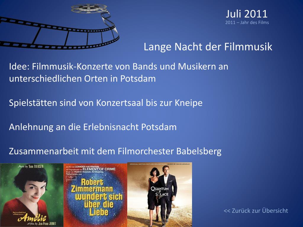 Juli 2011 2011 – Jahr des Films Lange Nacht der Filmmusik Idee: Filmmusik-Konzerte von Bands und Musikern an unterschiedlichen Orten in Potsdam Spielstätten sind von Konzertsaal bis zur Kneipe Anlehnung an die Erlebnisnacht Potsdam Zusammenarbeit mit dem Filmorchester Babelsberg << Zurück zur Übersicht