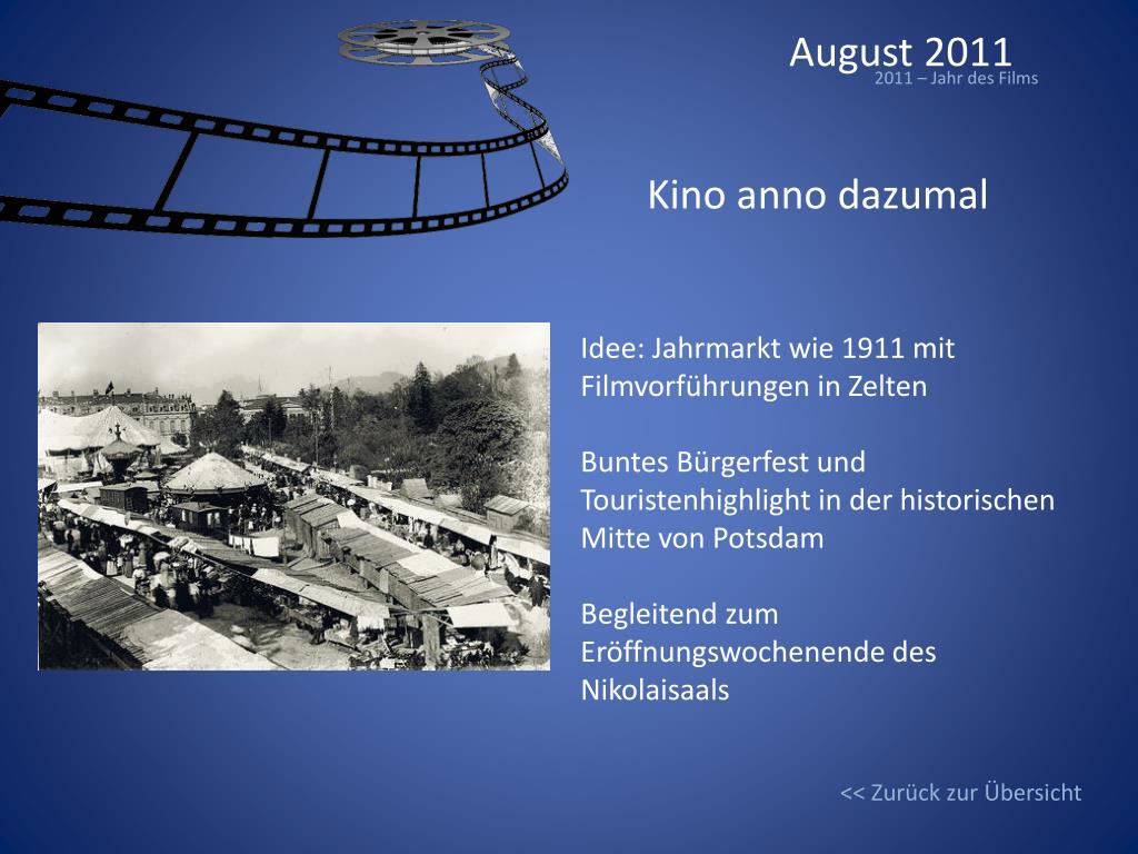 August 2011 2011 – Jahr des Films Kino anno dazumal Idee: Jahrmarkt wie 1911 mit Filmvorführungen in Zelten Buntes Bürgerfest und Touristenhighlight in der historischen Mitte von Potsdam Begleitend zum Eröffnungswochenende des Nikolaisaals << Zurück zur Übersicht