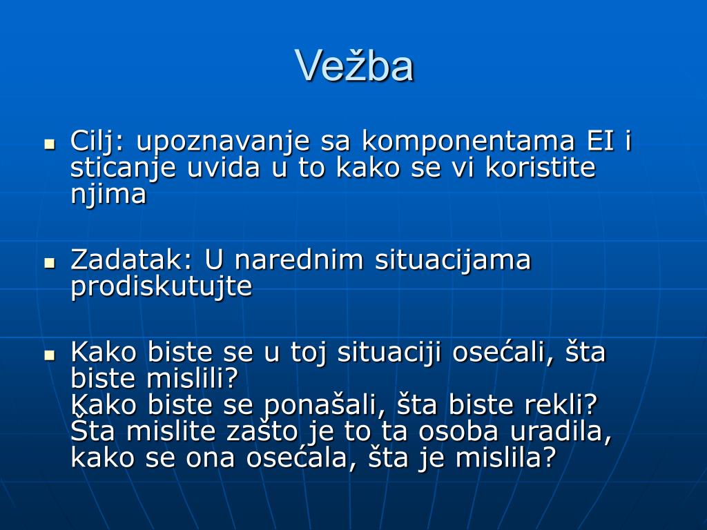 Vežba • Cilj: upoznavanje sa komponentama EI i sticanje uvida u to kako se vi koristite njima • Zadatak: U narednim situacijama prodiskutujte • Kako biste se u toj situaciji osećali, šta biste mislili? Kako biste se ponašali, šta biste rekli?Šta mislite zašto je to ta osoba uradila, kako se ona osećala, šta je mislila?
