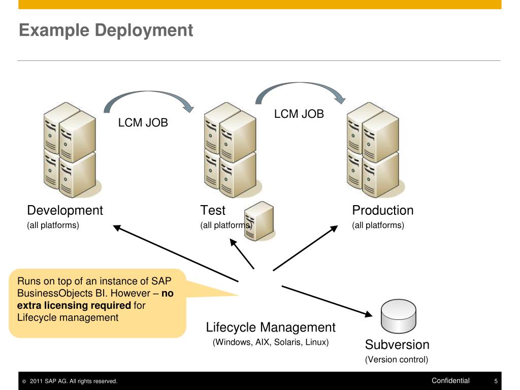 Example Deployment LCM JOB LCM JOB • Development • (all platforms) • Test • (all platforms) • Production • (all platforms) Runs on top of an instance of SAP BusinessObjects BI. However – no extra licensing required for Lifecycle management • Lifecycle Management • (Windows, AIX, Solaris, Linux) • Subversion • (Version control)