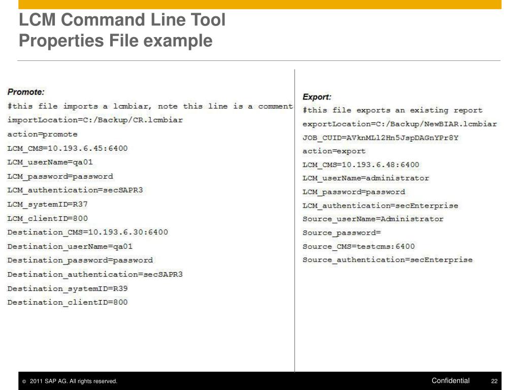 LCM Command Line Tool How to use? • Prerequisites: • Set the java path if using lcm.jar • Parameters are specified in a properties file. • Properties file name should be: <FileName>.properties. • Example: Myparameters.properties • LCM Command Line tool can be launched via BAT file or JAR file: • lcm_cli.bat • lcm_cli.bat –lcmproperty <property file> • Example: c:\Program Files(x86)\SAP Business Objects\SAP BusinessObjects Enterprise XI4.0\win64_x64\scripts\lcm_cli.bat –lcmpropertyMyparameters.properties • lcm.jar • java -cp "lcm.jar" com.businessobjects.lcm.cli.LCMCLI <property file> • Example: c:\Program Files(x86)\SAP Business Objects\SAP BusinessObjects Enterprise XI4.0\win64_x64\java\lib\ java –cp “lcm.jar” com.businessobjects.lcm.cli.LCMCLIMyparameters.properties