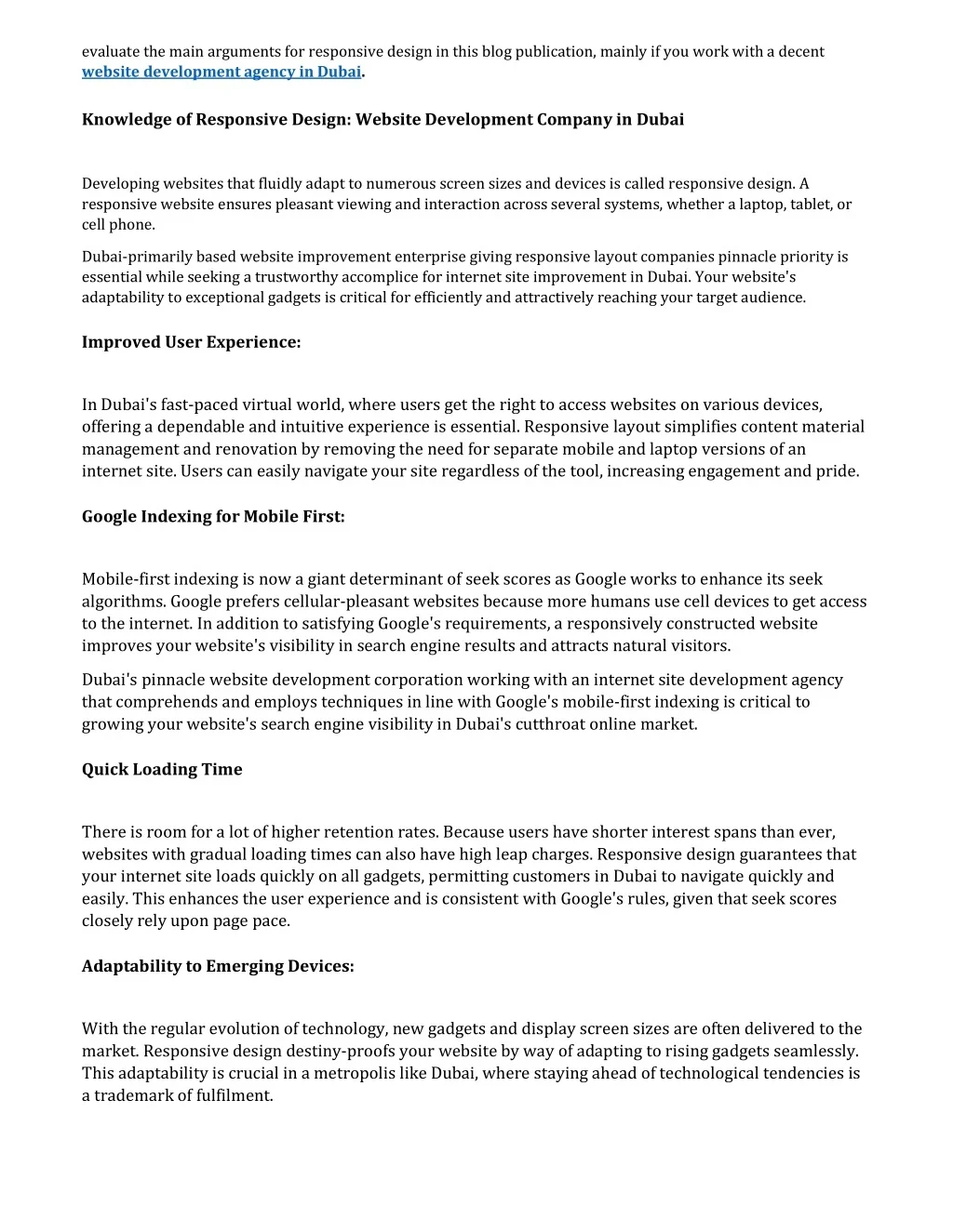 evaluate the main arguments for responsive design in this blog publication, mainly if you work with a decent website development agency in Dubai. Knowledge of Responsive Design: Website Development Company in Dubai Developing websites that fluidly adapt to numerous screen sizes and devices is called responsive design. A responsive website ensures pleasant viewing and interaction across several systems, whether a laptop, tablet, or cell phone. Dubai-primarily based website improvement enterprise giving responsive layout companies pinnacle priority is essential while seeking a trustworthy accomplice for internet site improvement in Dubai. Your website's adaptability to exceptional gadgets is critical for efficiently and attractively reaching your target audience. Improved User Experience: In Dubai's fast-paced virtual world, where users get the right to access websites on various devices, offering a dependable and intuitive experience is essential. Responsive layout simplifies content material management and renovation by removing the need for separate mobile and laptop versions of an internet site. Users can easily navigate your site regardless of the tool, increasing engagement and pride. Google Indexing for Mobile First: Mobile-first indexing is now a giant determinant of seek scores as Google works to enhance its seek algorithms. Google prefers cellular-pleasant websites because more humans use cell devices to get access to the internet. In addition to satisfying Google's requirements, a responsively constructed website improves your website's visibility in search engine results and attracts natural visitors. Dubai's pinnacle website development corporation working with an internet site development agency that comprehends and employs techniques in line with Google's mobile-first indexing is critical to growing your website's search engine visibility in Dubai's cutthroat online market. Quick Loading Time There is room for a lot of higher retention rates. Because users have shorter interest spans than ever, websites with gradual loading times can also have high leap charges. Responsive design guarantees that your internet site loads quickly on all gadgets, permitting customers in Dubai to navigate quickly and easily. This enhances the user experience and is consistent with Google's rules, given that seek scores closely rely upon page pace. Adaptability to Emerging Devices: With the regular evolution of technology, new gadgets and display screen sizes are often delivered to the market. Responsive design destiny-proofs your website by way of adapting to rising gadgets seamlessly. This adaptability is crucial in a metropolis like Dubai, where staying ahead of technological tendencies is a trademark of fulfilment.