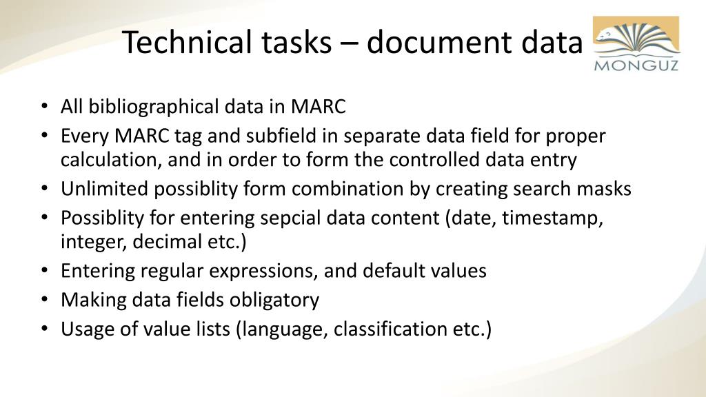 Technicaltasks – documentdata • Allbibliographicaldatain MARC • Every MARC tag and subfieldinseparatedatafieldforpropercalculation, andinordertoformthecontrolleddataentry • Unlimitedpossiblityformcombinationbycreating search masks • Possiblityfor entering sepcialdatacontent (date, timestamp, integer, decimal etc.) • Entering regularexpressions, and defaultvalues • Makingdatafieldsobligatory • Usage of value lists (language, classification etc.)