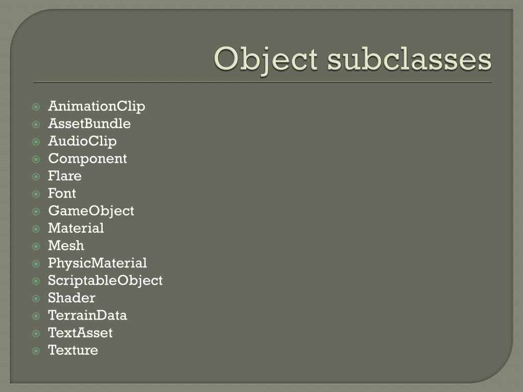 Object subclasses AnimationClip AssetBundle AudioClip Component Flare Font GameObject Material Mesh PhysicMaterial ScriptableObject Shader TerrainData TextAsset Texture