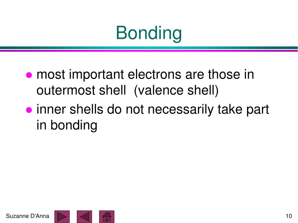 Bonding • most important electrons are those in outermost shell (valence shell) • inner shells do not necessarily take part in bonding