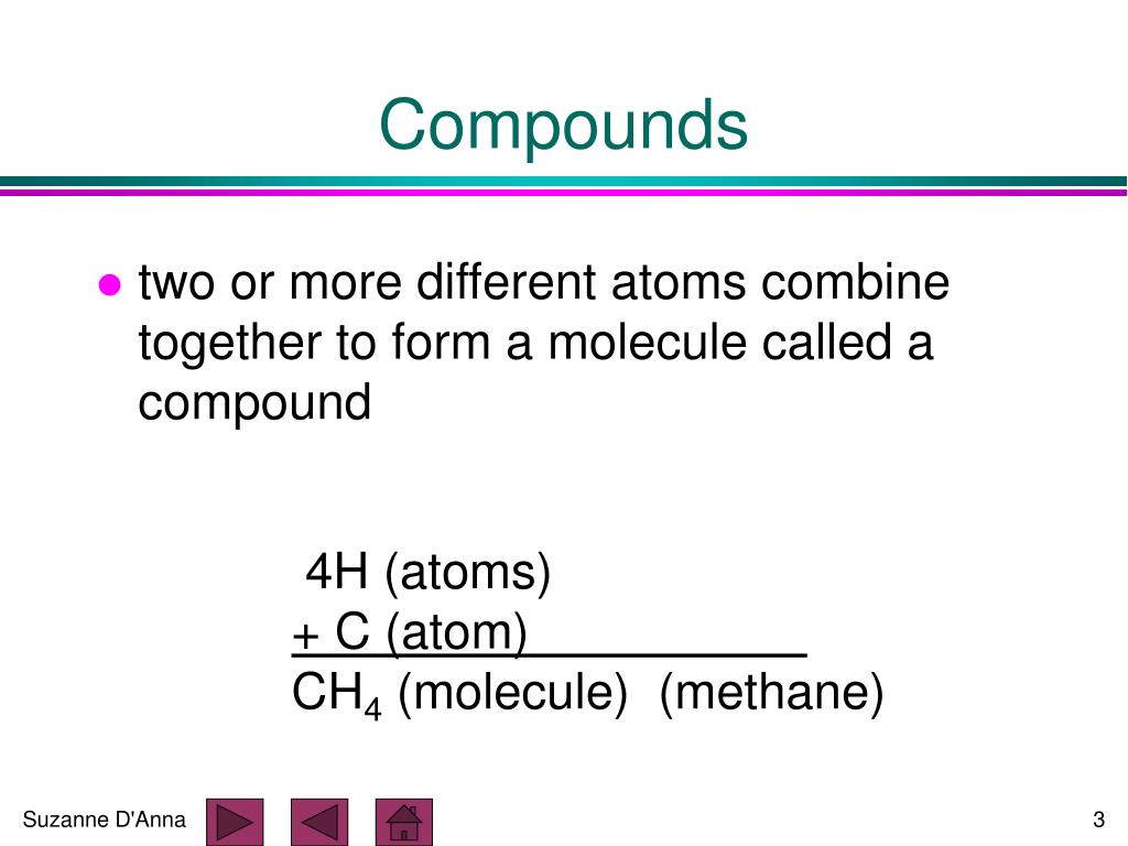 Compounds • two or more different atoms combine together to form a molecule called a compound 4H (atoms) + C (atom) CH4 (molecule) (methane)