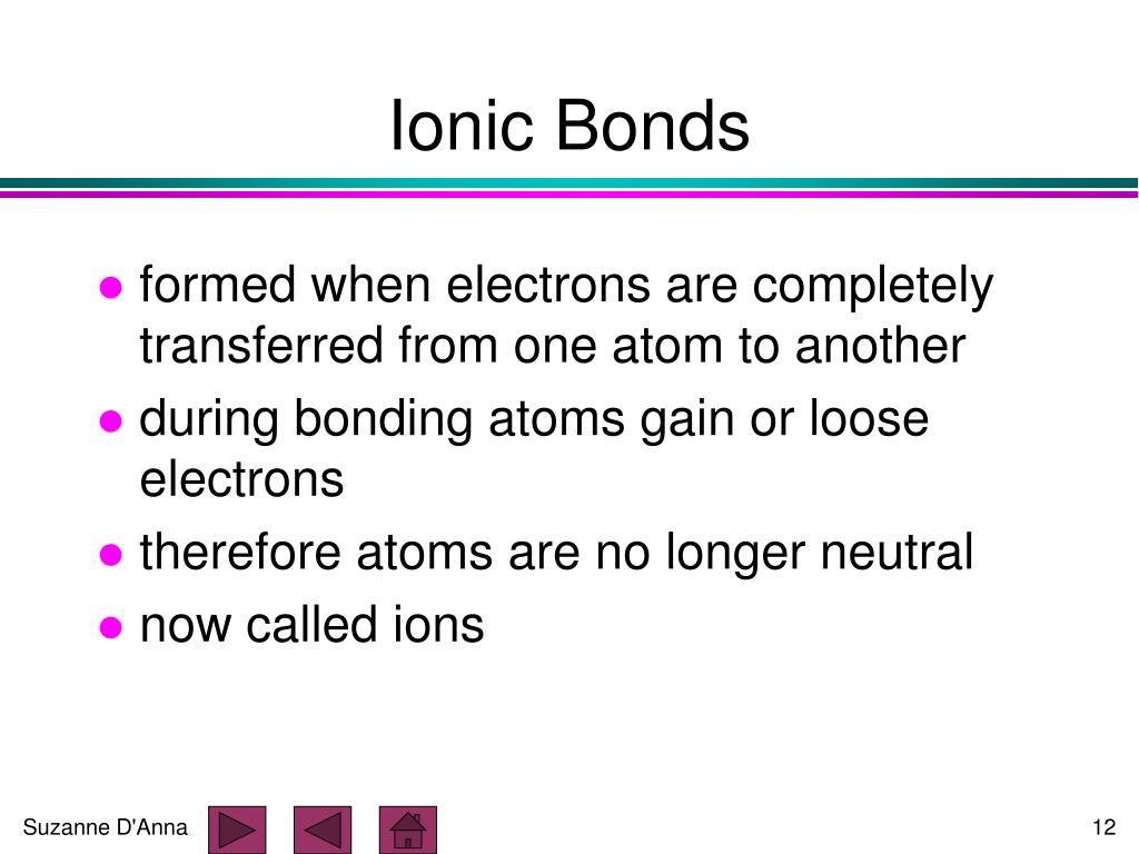 Ionic Bonds • formed when electrons are completely transferred from one atom to another • during bonding atoms gain or loose electrons • therefore atoms are no longer neutral • now called ions