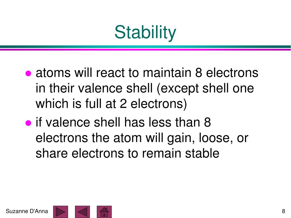 Stability • atoms will react to maintain 8 electrons in their valence shell (except shell one which is full at 2 electrons) • if valence shell has less than 8 electrons the atom will gain, loose, or share electrons to remain stable