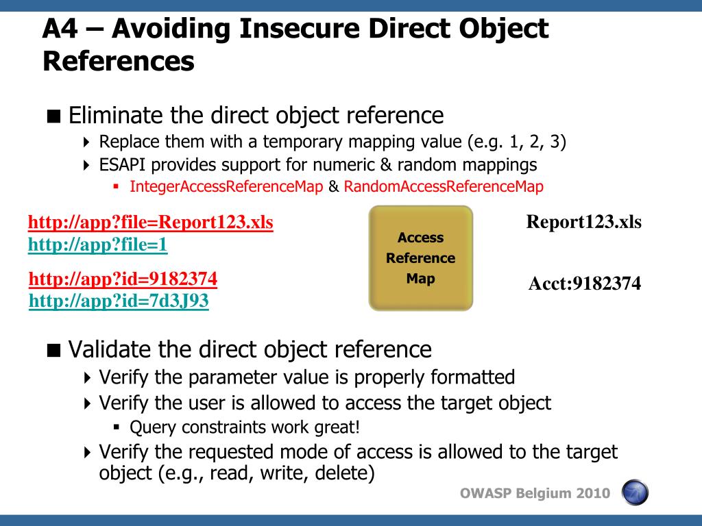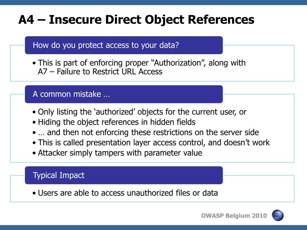 Insecure Direct Object References Illustrated • Attacker notices his acct parameter is 6065 ?acct=6065 • He modifies it to a nearby number ?acct=6066 • Attacker views the victim’s account information https://www.onlinebank.com/user?acct=6065