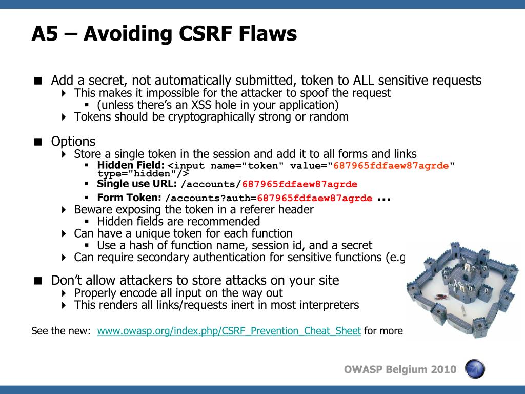 A5 – Avoiding CSRF Flaws • Add a secret, not automatically submitted, token to ALL sensitive requests • This makes it impossible for the attacker to spoof the request • (unless there’s an XSS hole in your application) • Tokens should be cryptographically strong or random • Options • Store a single token in the session and add it to all forms and links • Hidden Field: <input name="token" value="687965fdfaew87agrde" type="hidden"/> • Single use URL: /accounts/687965fdfaew87agrde • Form Token: /accounts?auth=687965fdfaew87agrde… • Beware exposing the token in a referer header • Hidden fields are recommended • Can have a unique token for each function • Use a hash of function name, session id, and a secret • Can require secondary authentication for sensitive functions (e.g., eTrade) • Don’t allow attackers to store attacks on your site • Properly encode all input on the way out • This renders all links/requests inert in most interpreters See the new: www.owasp.org/index.php/CSRF_Prevention_Cheat_Sheet for more details