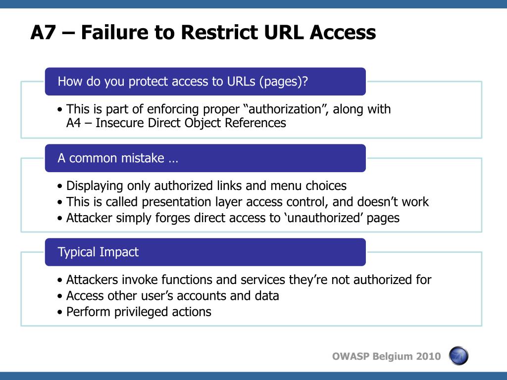 A7 – Avoiding URL Access Control Flaws • For each URL, a site needs to do 3 things • Restrict access to authenticated users (if not public) • Enforce any user or role based permissions (if private) • Completely disallow requests to unauthorized page types (e.g., config files, log files, source files, etc.) • Verify your architecture • Use a simple, positive model at every layer • Be sure you actually have a mechanism at every layer • Verify the implementation • Forget automated analysis approaches • Verify that each URL in your application is protected by either • An external filter, like Java EE web.xml or a commercial product • Or internal checks in YOUR code – Use ESAPI’s isAuthorizedForURL() method • Verify the server configuration disallows requests to unauthorized file types • Use WebScarab or your browser to forge unauthorized requests