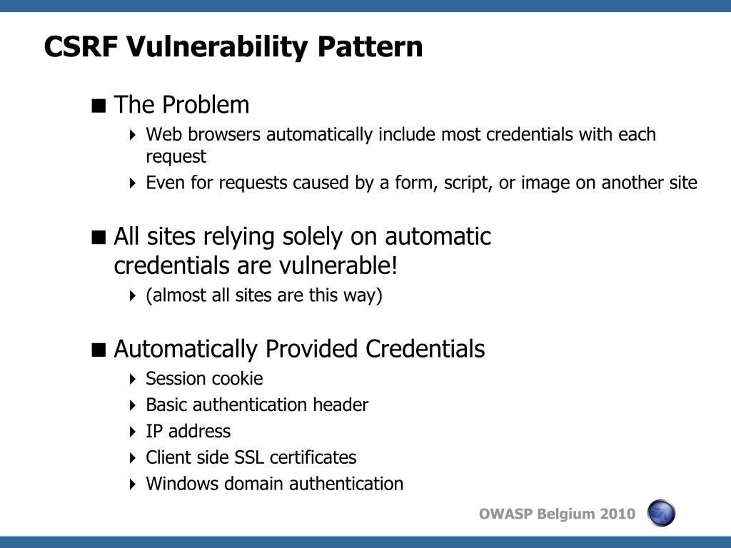The Problem Web browsers automatically include most credentials with each request Even for requests caused by a form, script, or image on another site All sites relying solely on automatic credentials are vulnerable! (almost all sites are this way) Automatically Provided Credentials Session cookie Basic authentication header IP address Client side SSL certificates Windows domain authentication CSRF Vulnerability Pattern