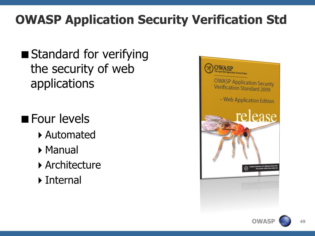 OWASP Application Security Verification Std • Standard for verifying the security of web applications • Four levels • Automated • Manual • Architecture • Internal