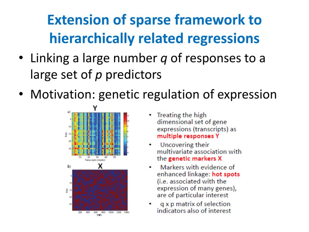 Extension of sparse framework to hierarchically related regressions • Linking a large number q of responses to a large set of p predictors • Motivation: genetic regulation of expression