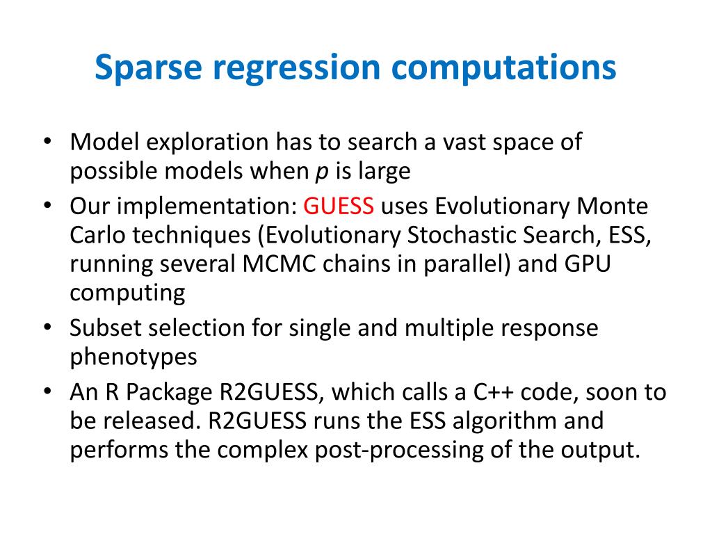 Sparse regression computations • Model exploration has to search a vast space of possible models when p is large • Our implementation: GUESS uses Evolutionary Monte Carlo techniques (Evolutionary Stochastic Search, ESS, running several MCMC chains in parallel) and GPU computing • Subset selection for single and multiple response phenotypes • An R Package R2GUESS, which calls a C++ code, soon to be released. R2GUESS runs the ESS algorithm and performs the complex post-processing of the output.