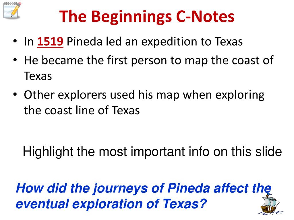 The Beginnings C-Notes In 1519Pineda led an expedition to Texas He became the first person to map the coast of Texas Other explorers used his map when exploring the coast line of Texas Highlight the most important info on this slide How did the journeys of Pineda affect the eventual exploration of Texas?