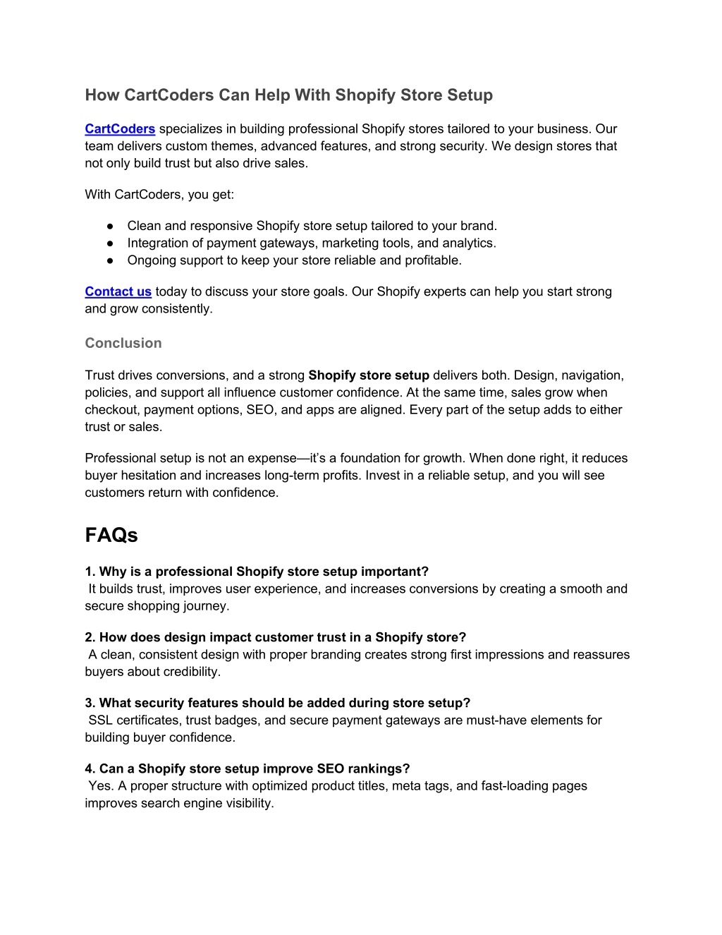 How CartCoders Can Help With Shopify Store Setup CartCoders specializes in building professional Shopify stores tailored to your business. Our team delivers custom themes, advanced features, and strong security. We design stores that not only build trust but also drive sales. With CartCoders, you get: ● ● ● Clean and responsive Shopify store setup tailored to your brand. Integration of payment gateways, marketing tools, and analytics. Ongoing support to keep your store reliable and profitable. Contact us today to discuss your store goals. Our Shopify experts can help you start strong and grow consistently. Conclusion Trust drives conversions, and a strong Shopify store setup delivers both. Design, navigation, policies, and support all influence customer confidence. At the same time, sales grow when checkout, payment options, SEO, and apps are aligned. Every part of the setup adds to either trust or sales. Professional setup is not an expense—it’s a foundation for growth. When done right, it reduces buyer hesitation and increases long-term profits. Invest in a reliable setup, and you will see customers return with confidence. FAQs 1. Why is a professional Shopify store setup important? It builds trust, improves user experience, and increases conversions by creating a smooth and secure shopping journey. 2. How does design impact customer trust in a Shopify store? A clean, consistent design with proper branding creates strong first impressions and reassures buyers about credibility. 3. What security features should be added during store setup? SSL certificates, trust badges, and secure payment gateways are must-have elements for building buyer confidence. 4. Can a Shopify store setup improve SEO rankings? Yes. A proper structure with optimized product titles, meta tags, and fast-loading pages improves search engine visibility.