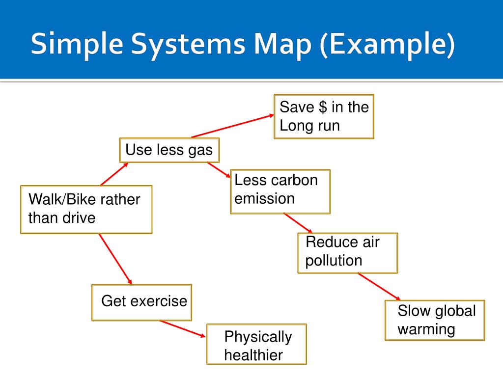 Simple Systems Map (Example) Save $ in the Long run Use less gas Less carbon emission Walk/Bike rather than drive Reduce air pollution Get exercise Slow global warming Physically healthier