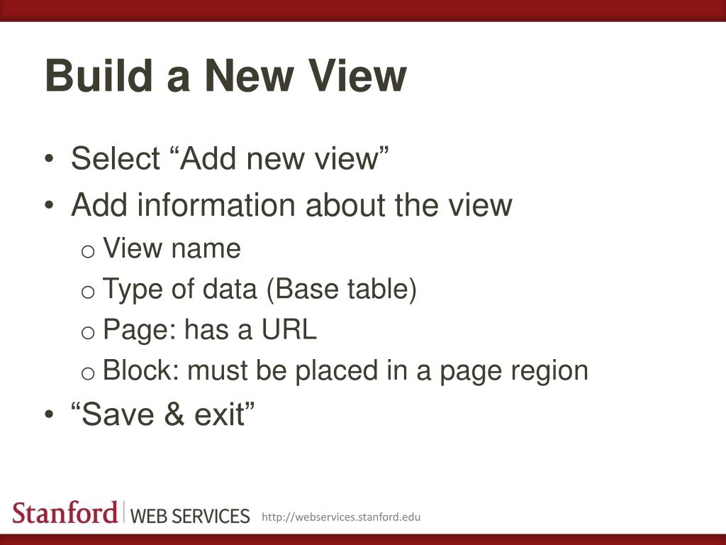Build a New View • Select “Add new view” • Add information about the view • View name • Type of data (Base table) • Page: has a URL • Block: must be placed in a page region • “Save & exit”