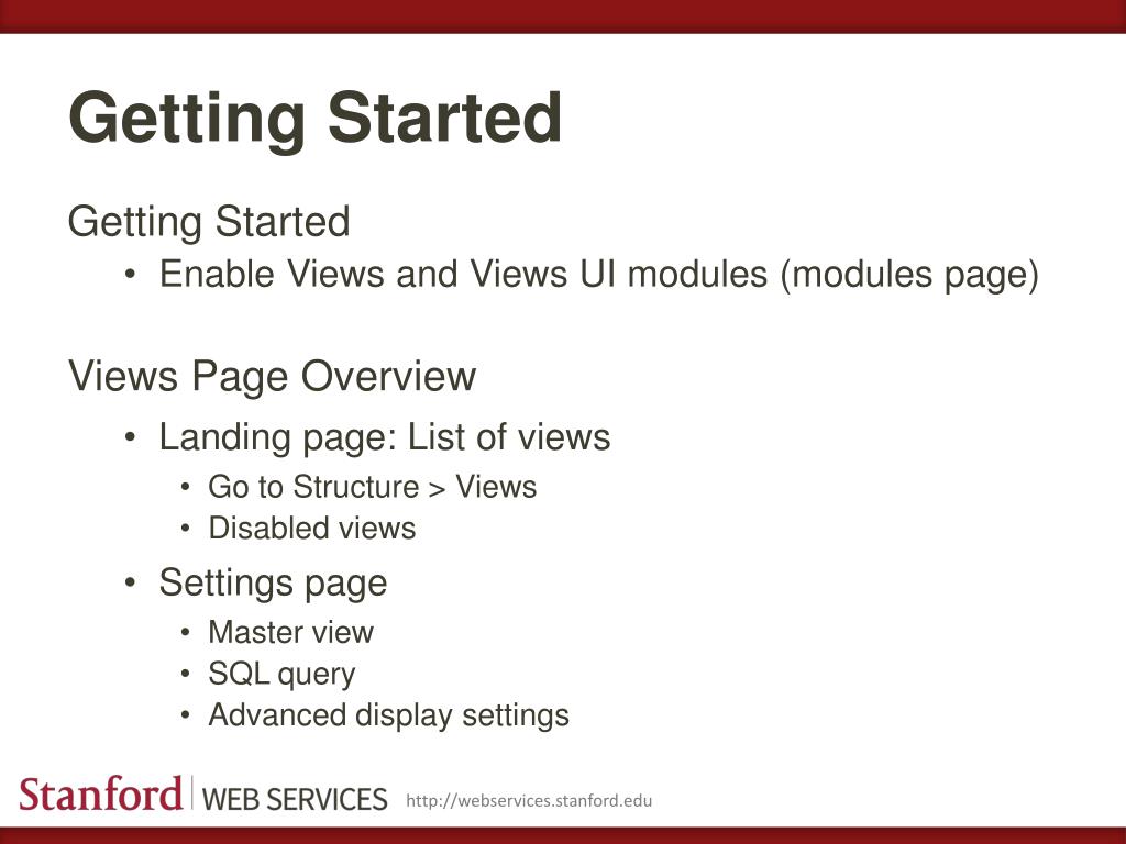 Getting Started Getting Started • Enable Views and Views UI modules (modules page) Views Page Overview • Landing page: List of views • Go to Structure > Views • Disabled views • Settings page • Master view • SQL query • Advanced display settings