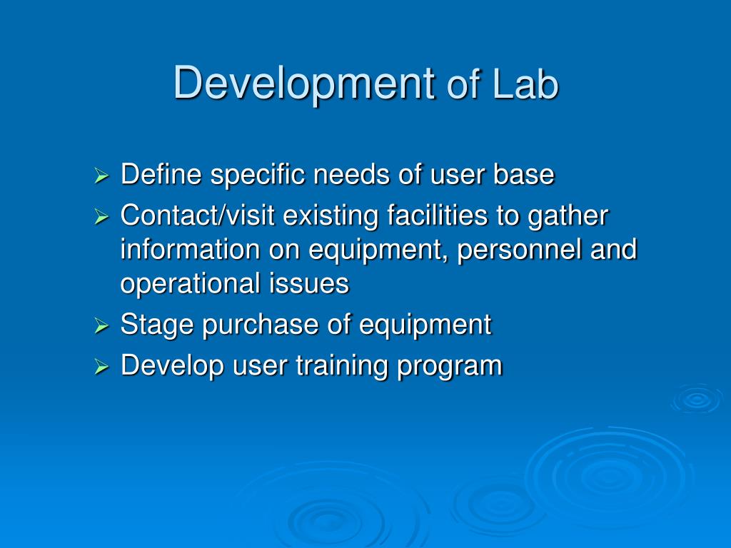 Development of Lab • Define specific needs of user base • Contact/visit existing facilities to gather information on equipment, personnel and operational issues • Stage purchase of equipment • Develop user training program
