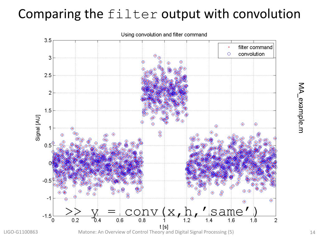 Comparing the filter output with convolution MA_example.m >> y = conv(x,h,’same’) Matone: An Overview of Control Theory and Digital Signal Processing (5)