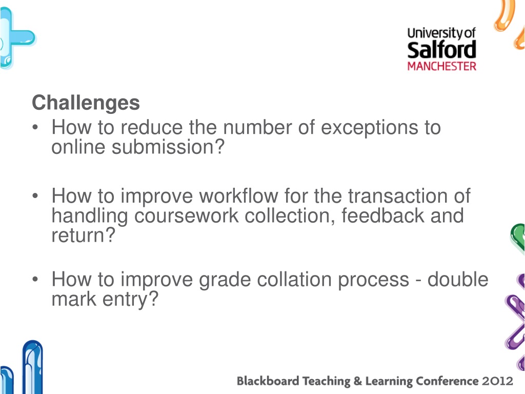 Challenges • How to reduce the number of exceptions to online submission? • How to improve workflow for the transaction of handling coursework collection, feedback and return? • How to improve grade collation process - double mark entry?