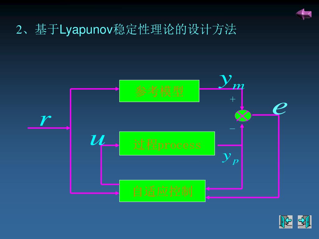 2、基于Lyapunov稳定性理论的设计方法 参考模型 + - 过程process 自适应控制