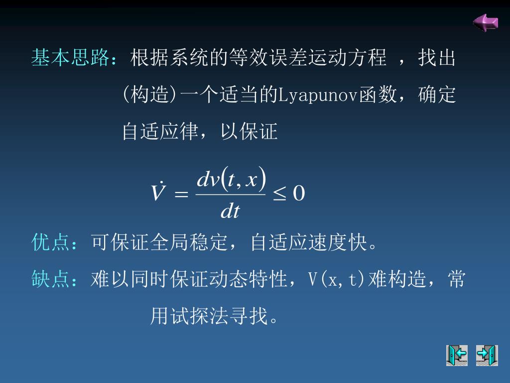 基本思路:根据系统的等效误差运动方程 ,找出 (构造)一个适当的Lyapunov函数,确定 自适应律,以保证 优点:可保证全局稳定,自适应速度快。 缺点:难以同时保证动态特性,V(x,t)难构造,常 用试探法寻找。