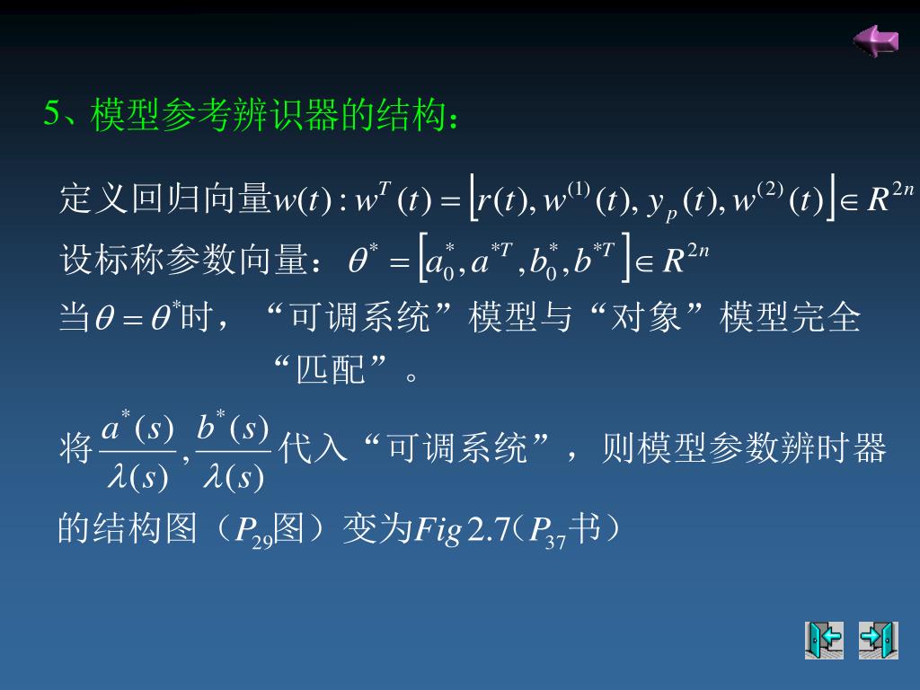 结构特点:MRAC的对偶系统,即将参考模型与可调 过程位置互换。 基本思想:同MARC设计思想,即通过自适应控制器 来调整模型使e(t)0,这样的模型就是我 们要辨识的结果。 *MRAC的结构具有对偶特点,它们既可用于自适应 模型跟随控制,也能用于自适应状态观测与辨识。