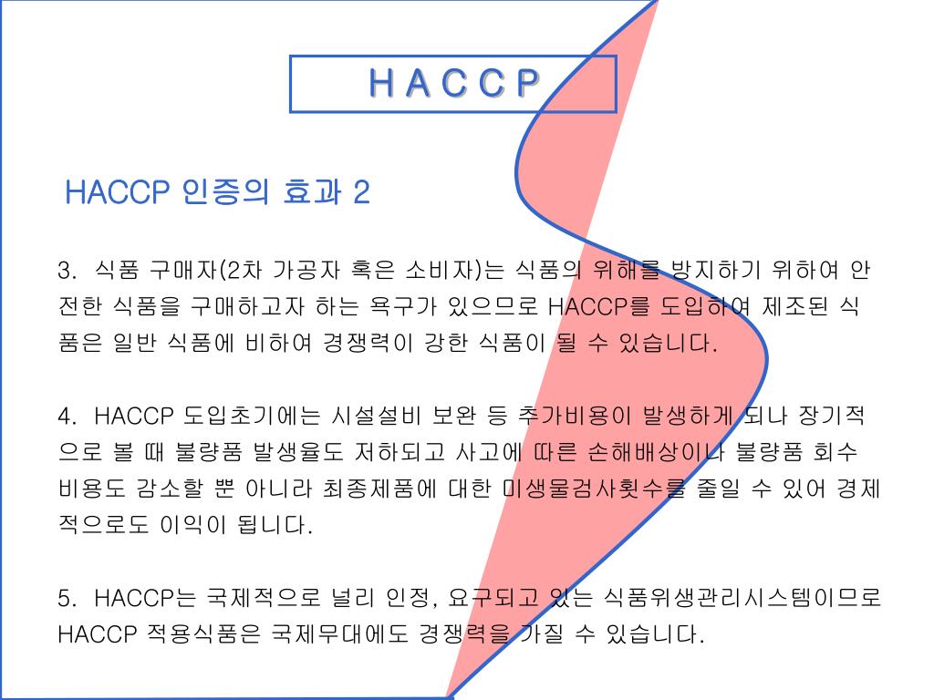 H A C C P HACCP 인증의 효과 1 HACCP는 식품의 안전대책을 마련할 수 있는 효과적인 시스템입니다. 1. 식품의 안전성이 향상됩니다.위해 분석을 수행하다 보면 종전의 제조방법을 평가하게 됨은 물론 관리해야 할 지점을 정확하게 파악하게 되므로 이 지점을 철저히 관리하면 보다 안전한 식품을 생산할 수 있습니다. 2. 식품의 안전성이 지속됩니다.아무리 완전한 제도라 하더라도 시간이 지남에 따라 유명무실해 질 수 있습니다. 그러나 HACCP는 계획대로 관리되고 있는지 정기적으로 검증하고 필요 시 시스템 변경을 하여 대처하므로 높은 위생수준을 유지할 수 있습니다.