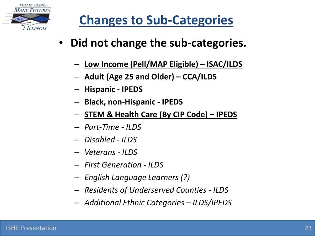 Changes to Sub-Categories • Did not change the sub-categories. • Low Income (Pell/MAP Eligible) – ISAC/ILDS • Adult (Age 25 and Older) – CCA/ILDS • Hispanic - IPEDS • Black, non-Hispanic - IPEDS • STEM & Health Care (By CIP Code) – IPEDS • Part-Time - ILDS • Disabled - ILDS • Veterans - ILDS • First Generation - ILDS • English Language Learners (?) • Residents of Underserved Counties - ILDS • Additional Ethnic Categories – ILDS/IPEDS IBHE Presentation