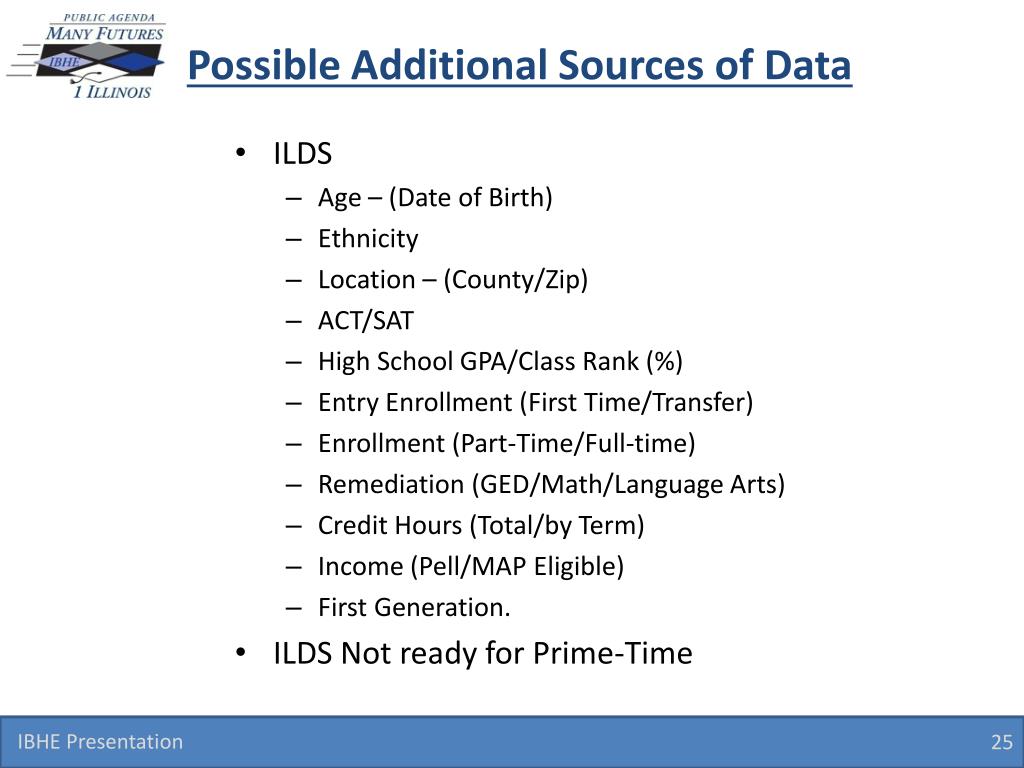Possible Additional Sources of Data • ILDS • Age – (Date of Birth) • Ethnicity • Location – (County/Zip) • ACT/SAT • High School GPA/Class Rank (%) • Entry Enrollment (First Time/Transfer) • Enrollment (Part-Time/Full-time) • Remediation (GED/Math/Language Arts) • Credit Hours (Total/by Term) • Income (Pell/MAP Eligible) • First Generation. • ILDS Not ready for Prime-Time IBHE Presentation