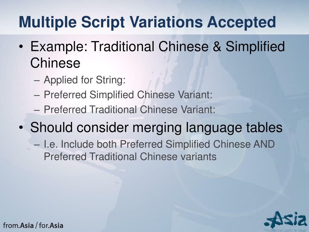 Multiple Script Variations Accepted • Example: Traditional Chinese & Simplified Chinese • Applied for String: • Preferred Simplified Chinese Variant: • Preferred Traditional Chinese Variant: • Should consider merging language tables • I.e. Include both Preferred Simplified Chinese AND Preferred Traditional Chinese variants