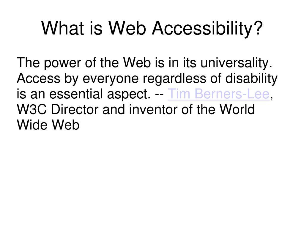 What is Web Accessibility? The power of the Web is in its universality. Access by everyone regardless of disability is an essential aspect. -- Tim Berners-Lee, W3C Director and inventor of the World Wide Web