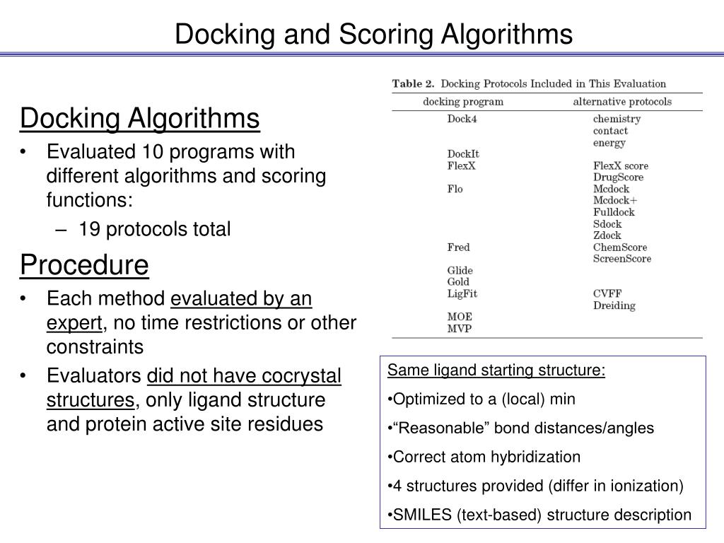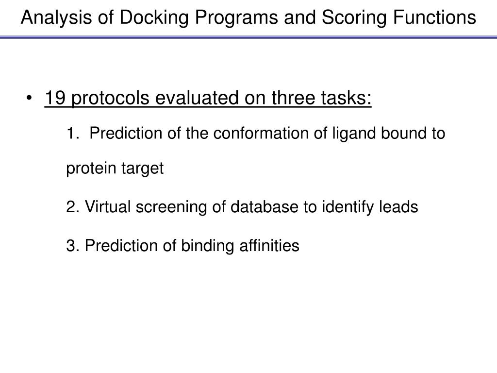 Analysis of Docking Programs and Scoring Functions • 19 protocols evaluated on three tasks: 1. Prediction of the conformation of ligand bound to protein target 2. Virtual screening of database to identify leads 3. Prediction of binding affinities