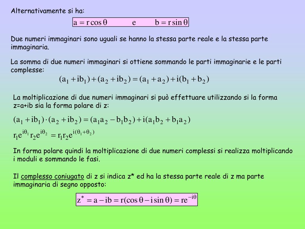 Alternativamente si ha: Due numeri immaginari sono uguali se hanno la stessa parte reale e la stessa parte immaginaria. La somma di due numeri immaginari si ottiene sommando le parti immaginarie e le parti complesse: La moltiplicazione di due numeri immaginari si può effettuare utilizzando si la forma z=a+ib sia la forma polare di z: Il complesso coniugato di z si indica z* ed ha la stessa parte reale di z ma parte immaginaria di segno opposto: In forma polare quindi la moltiplicazione di due numeri complessi si realizza moltiplicando i moduli e sommando le fasi.