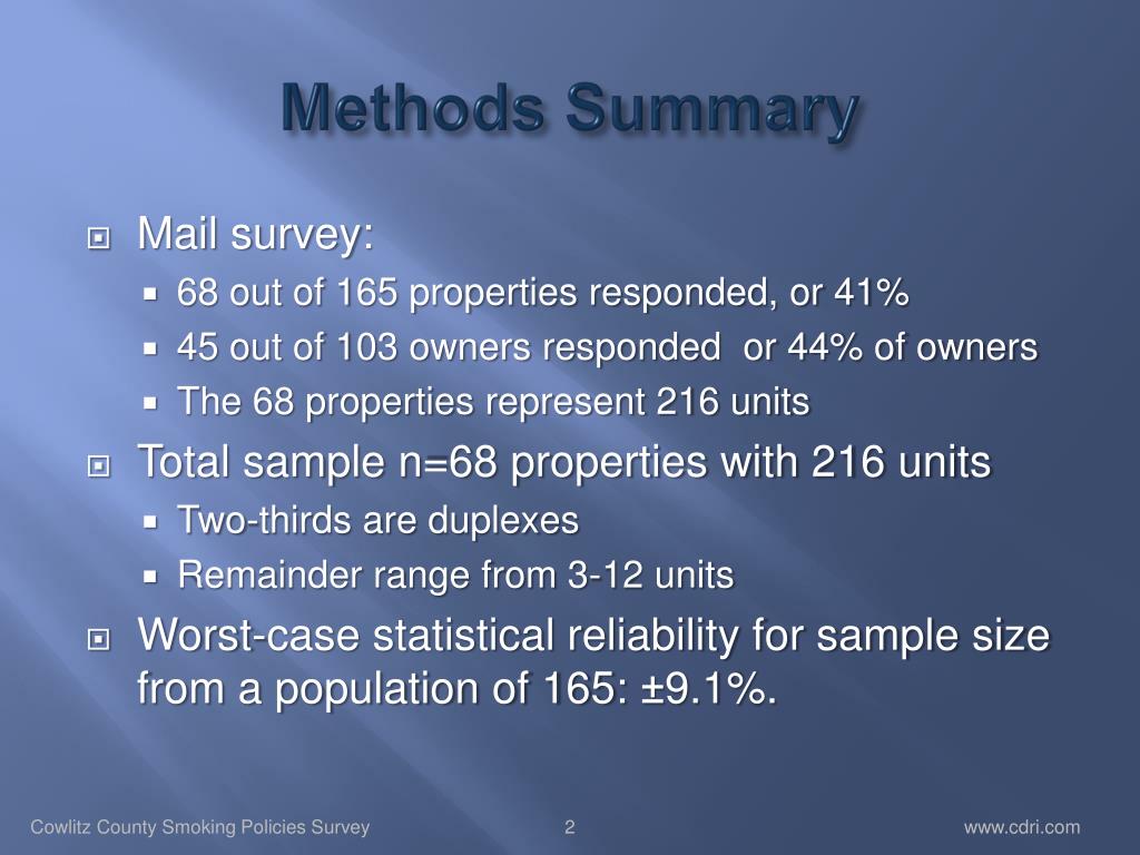 Voluntary Smoking Policies Survey. Research and analysis conducted for: Cowlitz County Health Department September 2012. Methods Summary. Mail survey: 68 out of 165 properties responded, or 41% 45 out of 103 owners responded or 44% of owners The 68 properties represent 216 units