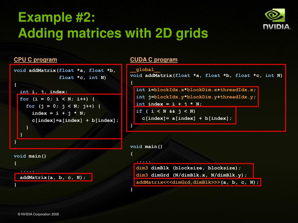 Example: Host code for vecAdd // allocate and initialize host (CPU) memory float *h_A = …, *h_B = …; // allocate device (GPU) memory float *d_A, *d_B, *d_C; cudaMalloc( (void**) &d_A, N * sizeof(float)); cudaMalloc( (void**) &d_B, N * sizeof(float)); cudaMalloc( (void**) &d_C, N * sizeof(float)); // copy host memory to device cudaMemcpy( d_A, h_A, N * sizeof(float), cudaMemcpyHostToDevice) ); cudaMemcpy( d_B, h_B, N * sizeof(float), cudaMemcpyHostToDevice) ); // execute the kernel on N/256 blocks of 256 threads each vecAdd<<<N/256, 256>>>(d_A, d_B, d_C);