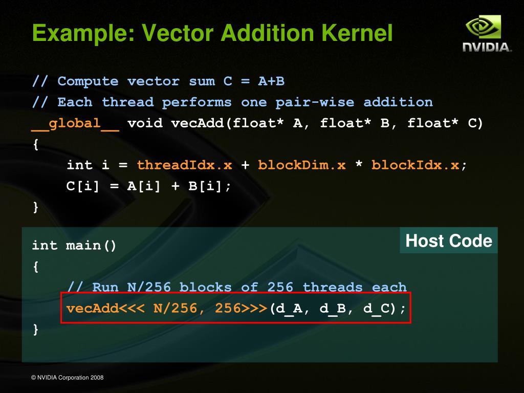 Example: Vector Addition Kernel // Compute vector sum C = A+B // Each thread performs one pair-wise addition __global__ void vecAdd(float* A, float* B, float* C) { inti = threadIdx.x + blockDim.x * blockIdx.x; C[i] = A[i] + B[i]; } int main() { // Run N/256 blocks of 256 threads each vecAdd<<< N/256, 256>>>(d_A, d_B, d_C); } Host Code