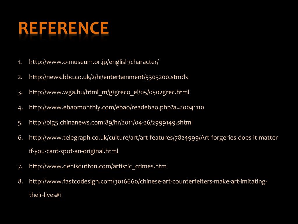 Reference • http://www.o-museum.or.jp/english/character/ • http://news.bbc.co.uk/2/hi/entertainment/5303200.stm?ls • http://www.wga.hu/html_m/g/greco_el/05/0502grec.html • http://www.ebaomonthly.com/ebao/readebao.php?a=20041110 • http://big5.chinanews.com:89/hr/2011/04-26/2999149.shtml • http://www.telegraph.co.uk/culture/art/art-features/7824999/Art-forgeries-does-it-matter-if-you-cant-spot-an-original.html • http://www.denisdutton.com/artistic_crimes.htm • http://www.fastcodesign.com/3016660/chinese-art-counterfeiters-make-art-imitating-their-lives#1