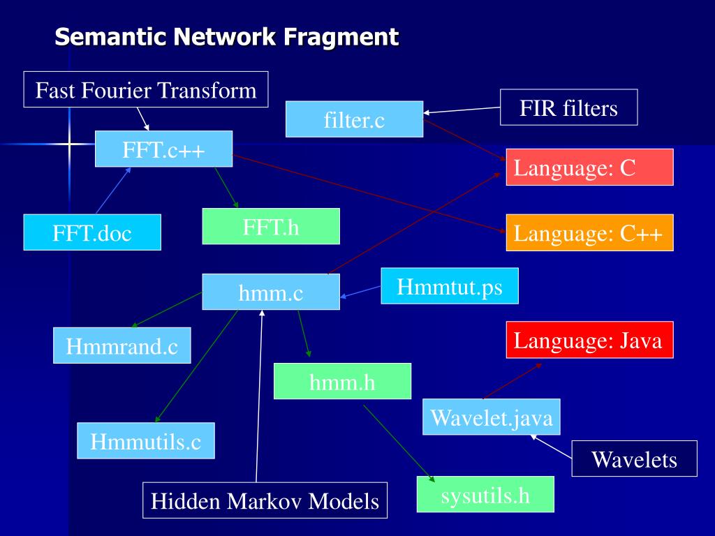 Semantic Network Fragment Fast Fourier Transform FIR filters filter.c FFT.c++ Language: C FFT.h FFT.doc Language: C++ Hmmtut.ps hmm.c Language: Java Hmmrand.c hmm.h Wavelet.java Hmmutils.c Wavelets sysutils.h Hidden Markov Models