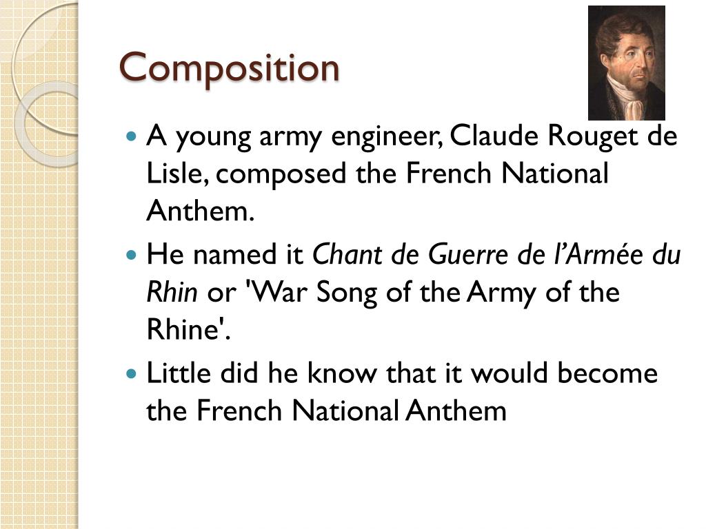 Composition • A young army engineer, Claude Rouget de Lisle, composed the French National Anthem. • He named it Chant de Guerre de l’Armée du Rhin or 'War Song of the Army of the Rhine'. • Little did he know that it would become the French National Anthem