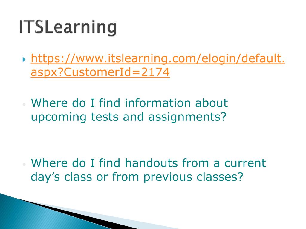 ITSLearning • https://www.itslearning.com/elogin/default.aspx?CustomerId=2174 • Where do I find information about upcoming tests and assignments? • Where do I find handouts from a current day’s class or from previous classes?