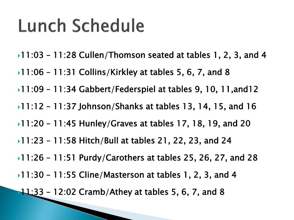 Lunch Schedule • 11:03 – 11:28 Cullen/Thomson seated at tables 1, 2, 3, and 4 • 11:06 – 11:31 Collins/Kirkley at tables 5, 6, 7, and 8 • 11:09 – 11:34 Gabbert/Federspiel at tables 9, 10, 11,and12 • 11:12 – 11:37 Johnson/Shanks at tables 13, 14, 15, and 16 • 11:20 – 11:45 Hunley/Graves at tables 17, 18, 19, and 20 • 11:23 – 11:58 Hitch/Bull at tables 21, 22, 23, and 24 • 11:26 – 11:51 Purdy/Carothers at tables 25, 26, 27, and 28 • 11:30 – 11:55 Cline/Masterson at tables 1, 2, 3, and 4 • 11:33 – 12:02 Cramb/Athey at tables 5, 6, 7, and 8