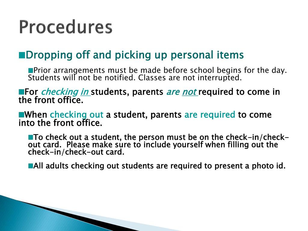Procedures • Dropping off and picking up personal items • Prior arrangements must be made before school begins for the day. Students will not be notified. Classes are not interrupted. • For checking in students, parents are not required to come in the front office. • When checking out a student, parents are required to come into the front office. • To check out a student, the person must be on the check-in/check-out card. Please make sure to include yourself when filling out the check-in/check-out card. • All adults checking out students are required to present a photo id.