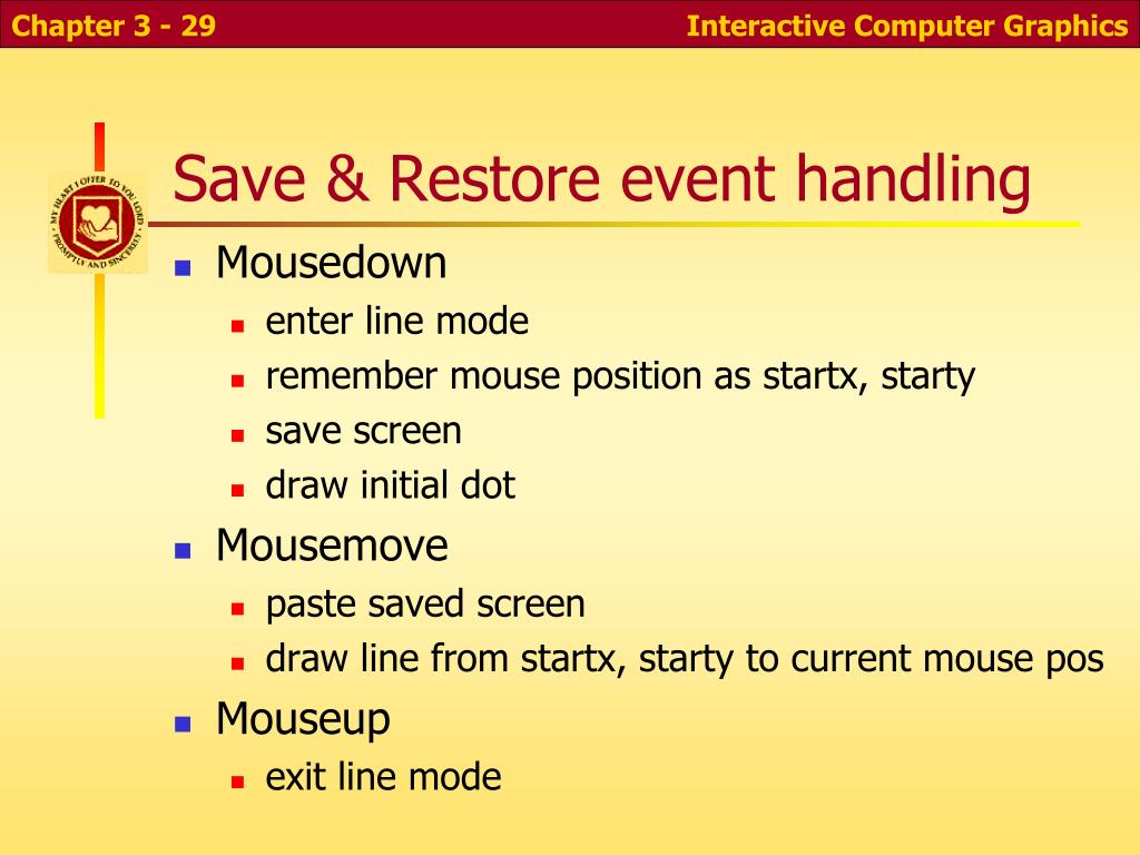 Save & Restore event handling • Mousedown • enter line mode • remember mouse position as startx, starty • save screen • draw initial dot • Mousemove • paste saved screen • draw line from startx, starty to current mouse pos • Mouseup • exit line mode