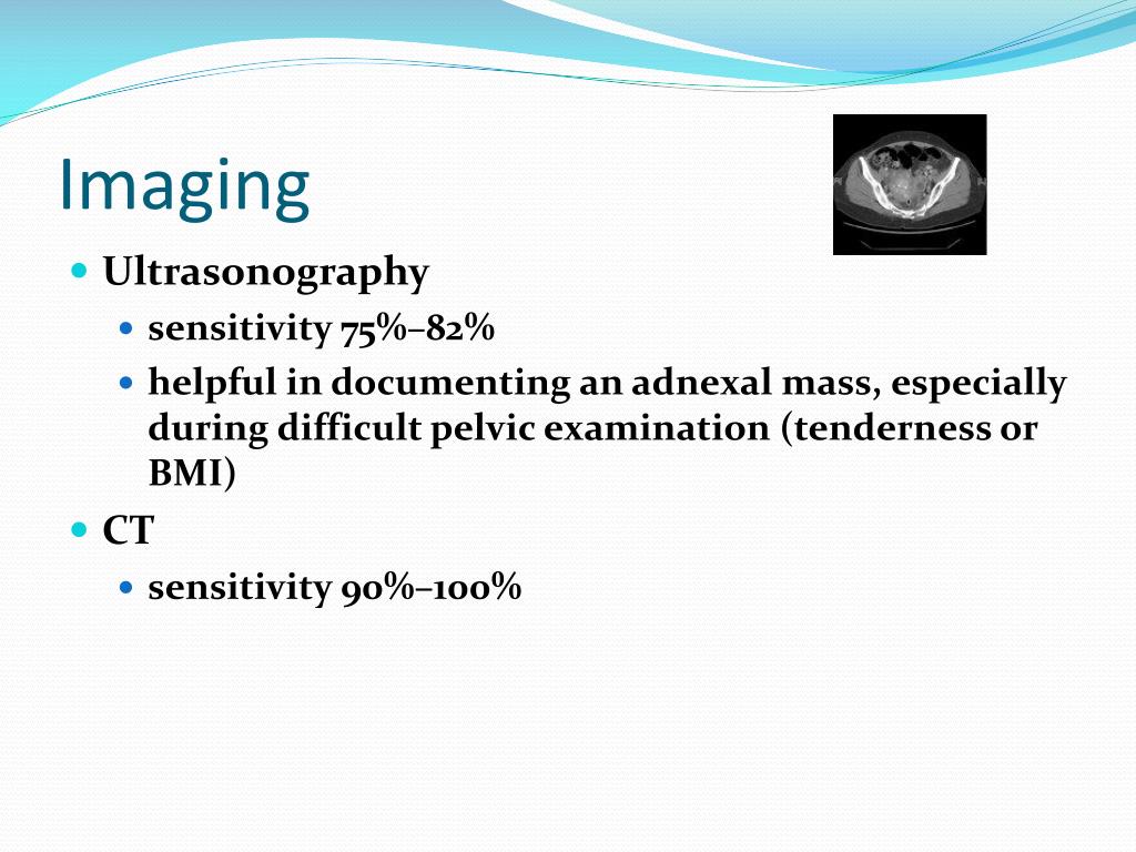 Imaging • Ultrasonography • sensitivity 75%–82% • helpful in documenting an adnexal mass, especially during difficult pelvic examination (tenderness or BMI) • CT • sensitivity 90%–100%